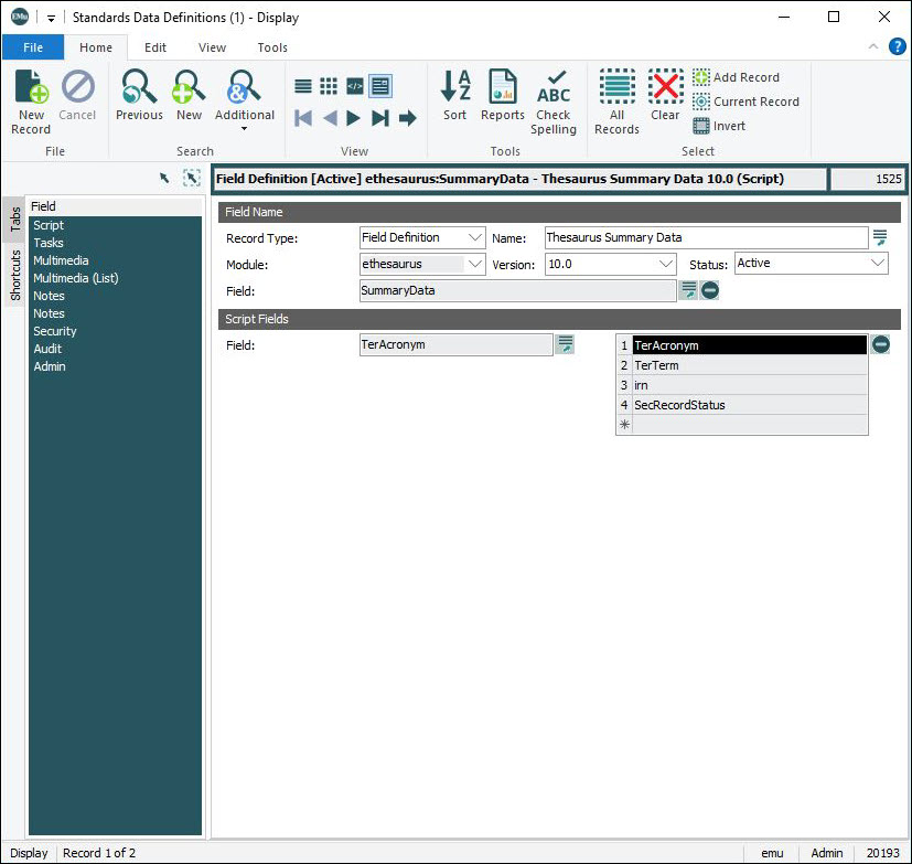 This entry specifies that the Summary Data and Extended Data values for the Thesaurus module are calculated via their respective Field Definition records in the Standards module:
