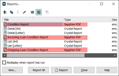 A Sapphire report is configured as any other EMu report (details here). In the example above, the Forms included in the Task all modify data in the Condition Checks (econdition) module and the three reports available to the Task were all defined in the Condition Checks module: