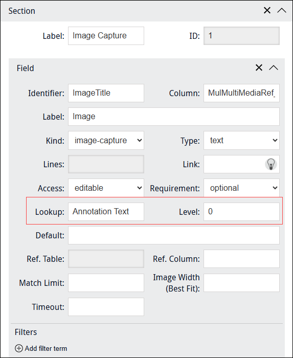 The field which holds details about images used during data capture is populated with these details when an image is uploaded using Sapphire. See Kind: image-capture for details. Note: The field can also be populated with details about images using various back-end scripts. Having added an image to the Form, we could then add fields necessary to record any details available on the image: |