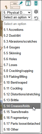 Reasons for annotating images can be defined in an EMu Lookup List and associated with the Annotate tool. Each option in the drop list has a specific colour and size, differentiating it from annotations for every other drop list option. In this example, annotations added when 5. Physical Damage is selected will have a different colour and size to annotations added when 6. Previous Repairs is selected.