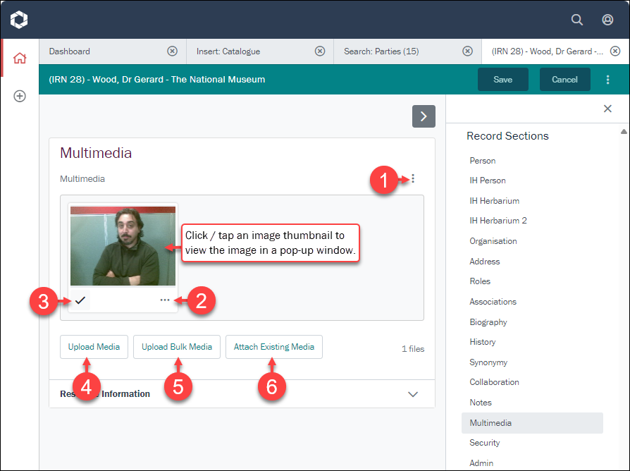 A record is created in the Multimedia module for each resource and attached to the current record.
