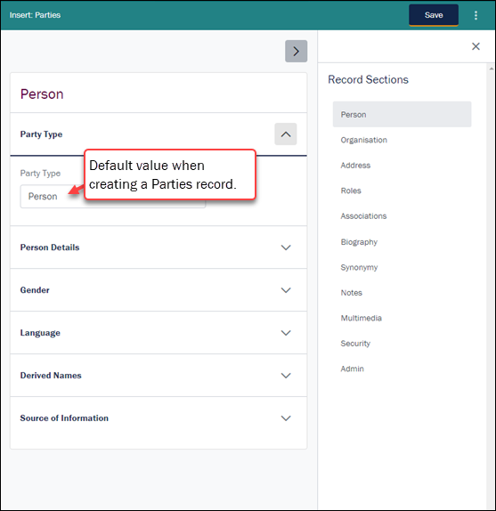 Often, when creating a new Parties record, the Party Type is Person and having a default value saves time and effort. If you are adding a Parties record for an organization, you would simply change the value in this field.