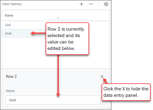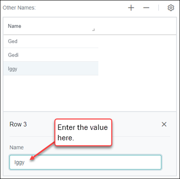 A good example of a single column table is Other Names: (Person Details) in the Parties module (in the Person Record Section). To change a value in a single column table, select its row in the table and edit it in the data entry panel that displays (below or to the right of the table depending on the size of your screen):