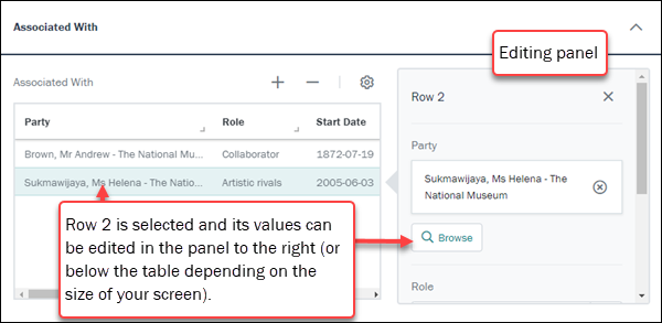 A good example of a multi-column table is Associated With in the Parties module (in the Associations Record Section). Each row holds details about an associated party, including a link to a Parties record, the role of the linked party, as well as start and end dates for the association.
