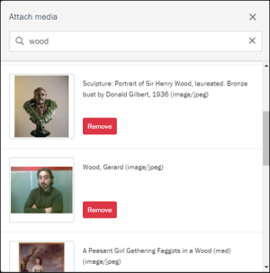 Select Attach Existing Media to locate and attach an existing Multimedia record to the current record (the media resource you want to attach to the current record is already recorded in the Multimedia module). The Attach media box will display with a list of available media: