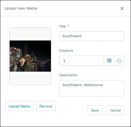 icon in the Creators field and search for the Parties record of one or more creators of the media (details about working with Lookup Lists can be found here). - (Optional) Add a description of the media in the Description field: