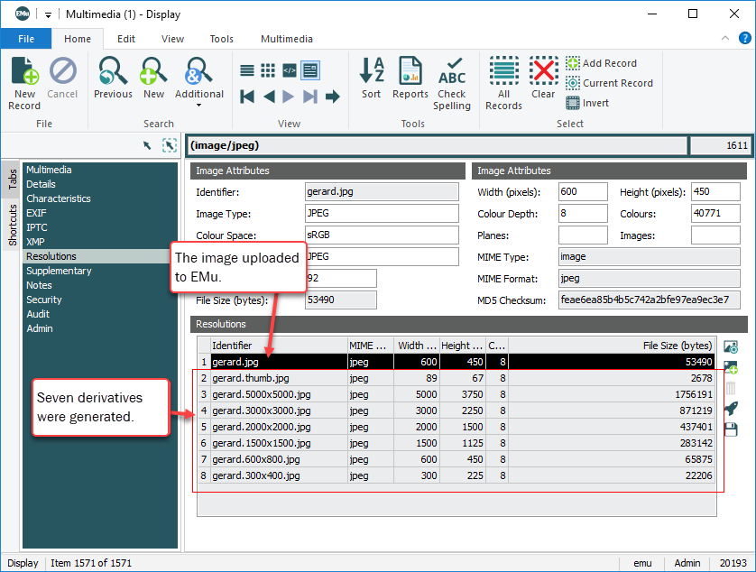 When multimedia resources (images, documents, etc.) are added to EMu it is possible to generate alternative formats (derivatives) automatically. When an image is added to EMu for instance, it is possible to generate different image formats and sizes automatically to satisfy different requirements: a thumbnail JPEG can be generated for browsing, an 800x600 PNG image for publication on the web, whilst maintaining the image in its original format and resolution.