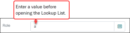 (Optional) Filter a Lookup List by entering letters before opening the Lookup Selection boxYou can reduce the number of values that display in a Lookup Selection box by entering letter(s) into a Lookup List field before opening the Lookup Selection box.