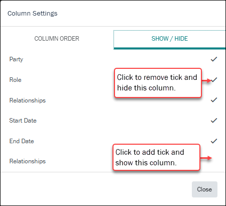 A good example of a multi-column table is Associated With in the Parties module (on the Associations tab). Each row holds details about an associated party, including a link to a Parties record, the role of the linked party, as well as start and end dates for the association: