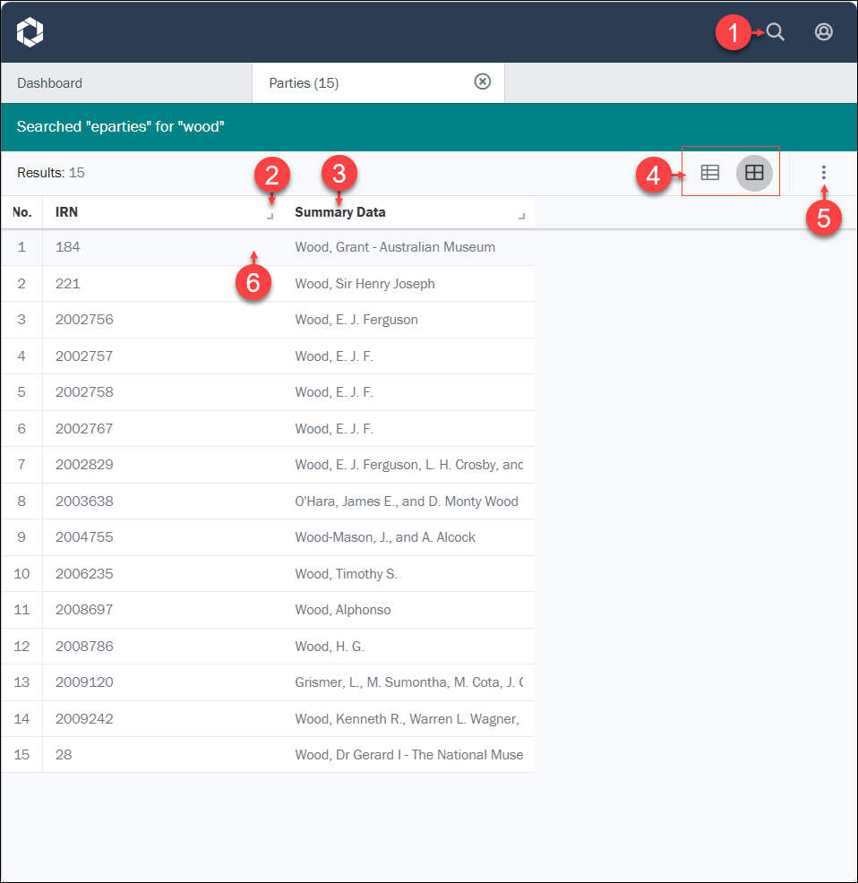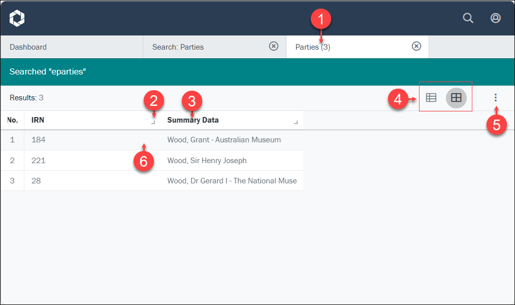 When you run your query by selecting the Search button (or use the CTRL+ENTER keyboard shortcut), your search results display in a new workspace with a label comprising the name of the module searched and the number of records returned, e.g.: