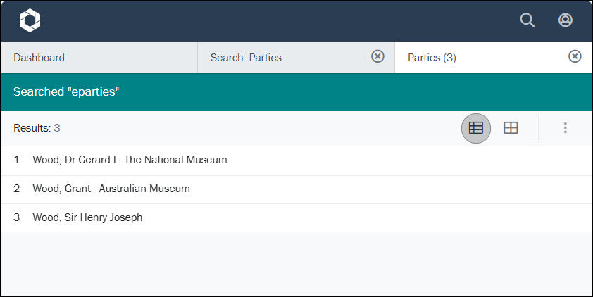 To run another search in the same module, return to the open Search workspace (Search: Parties in the example above), modify your search terms and run the query again; alternatively, open another Search workspace for the same module by selecting its button from the Command Centre (Parties in this case).