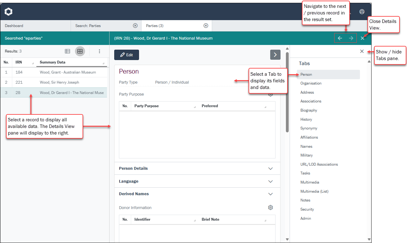 As with EMu, record data is organized into logical groupings on tabs. Below we see the Search workspace that opens when the Parties module button is selected in the Command Centre. The Parties module holds details about all people and organizations involved in some way with your institution's collection, and there is a tab for recording a person's name (Person tab), another for address details (Address tab), another for details about a person's roles (Roles tab), and another for recording biographical details (Biography tab), and so on. The main difference with the EMu desktop client is reversal of the layout in Axiell Go, with tabs listed in a panel on the right of the screen and the selected tab's fields displayed on the left:
