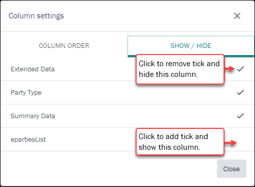 Select a row to show / hide a column (the tick toggles on to show and off to hide a column):