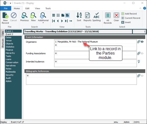 Your institution is organizing a travelling exhibition. The event organizer is a member of staff, Nick Margiolakis. To record this information in EMu you would create two records: