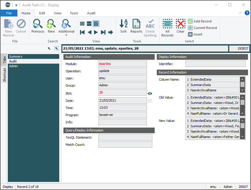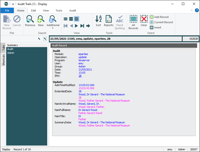 Presents the audit trail record as a single page display. This view consists of two sections. The Audit section contains information that is common to all audit trail records. The second section contains operation specific information. If the audit record is for an update operation, this view will contain the new and old values so that users can determine which fields have been modified: The old values are shown below the new values and in purple (in this example). It is possible to configure the colours used to display data using the Options box (File>Options) and selecting the Colours tab. Audit colour is used for current data, and Audit Previous is used for previous values: