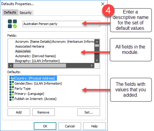The highlighted set of default values (Person Party in the image above) will load automatically. A different set of default values can be selected from the Defaults box as required (it will then load automatically whenever a new search is begun or a new record is added).
