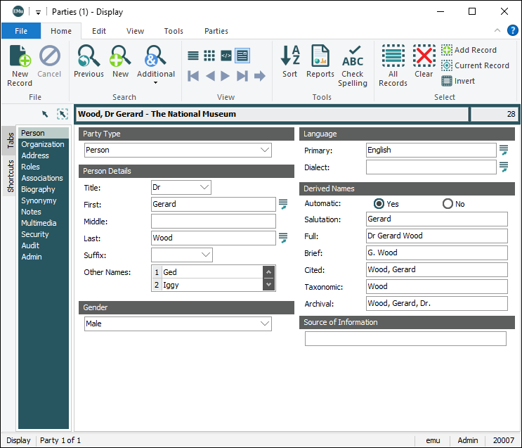 Note: In Details View the Status bar indicates the number of the displayed record in relation to the total number of records currently listed, e.g. record 3 of 3 or 1 of 5. The Title bar and Status bar indicate that we are in Display mode.
