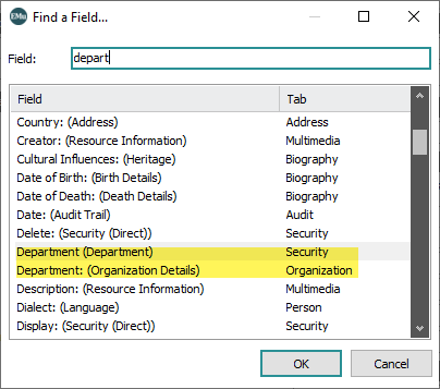Note that the same field name can be used on several tabs in the same module. To identify which field is which in the Find a Field box, the name of the Tab is listed beside the name of the field. In the example below, there are two Department fields, one on the Organization tab, the other on the Security tab: