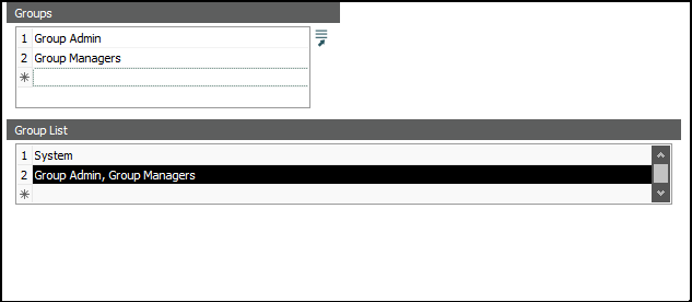 - On the Groups tab, click the row with an asterisk (*) in the Group List field.