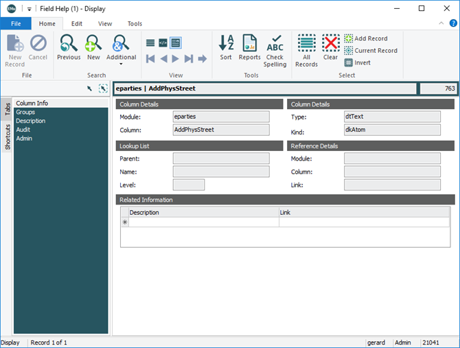 Click View to open the Field Help module and display the field level help record for the field. Amongst other things, it is possible to display different field help descriptions to different groups / users. This can be useful for providing specific information to different users / groups according to the business requirements of their role. Details below. |
