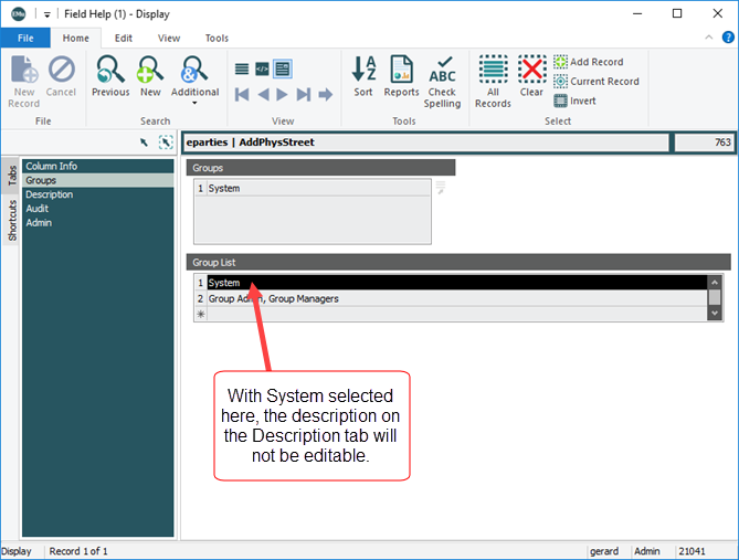 Select another group from the Group List to display the field level help description (on the Descriptions tab) for that group.