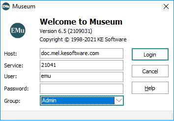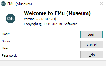 To begin working with EMu you must log in with a username and password. You may also need to specify which version of EMu to use.