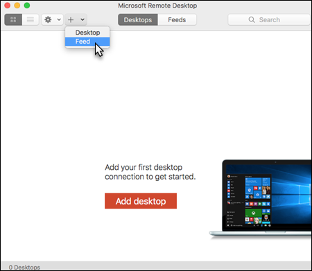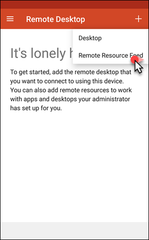 - Add a remote desktop connection by selecting the + and then Remote Resource Feed:
