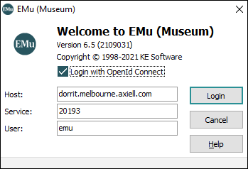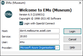 Note: The username only functions as a hint to the external identity provider as it is possible to sign into the provider with an account that is different from the one specified in EMu; this is resolved when you sign into the identity provider and the EMu client has connected to the EMu server.