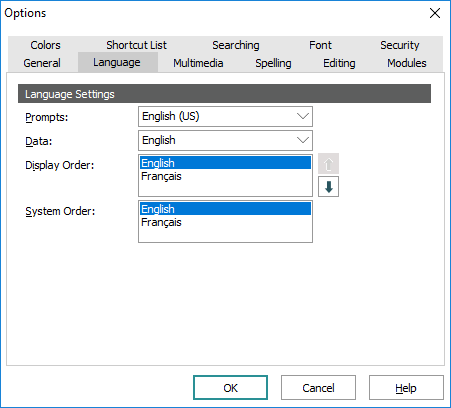 Note: The Language drop list does not allow all possible combinations of Prompts, Data and Display Order options to be set, however it does provide the most common alternatives. If further tuning of the settings is required, the Language Options box should be used.