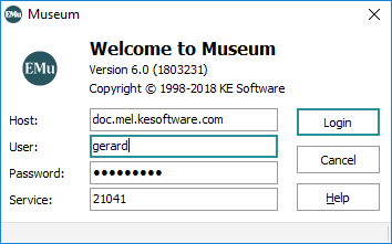 The first step for users using the Windows client to access EMu is to log in to the server. The familiar Login box allows a user to specify their: