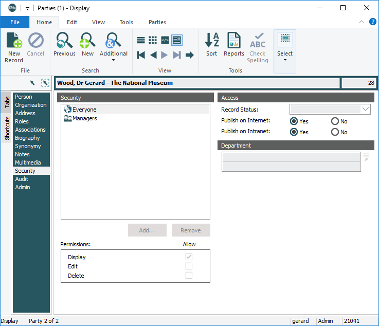 With Record Level Security it is possible, for example, to specify that Everyone can view all Parties records but only managers of each department are able to edit and delete the records of staff members in their department. In the following example, Everyone is able to view the current record (they have the Display permission), but only members of group Managers are able to edit and delete this record (the Edit and Delete permissions are disabled for group Everyone but enabled for group Managers):
