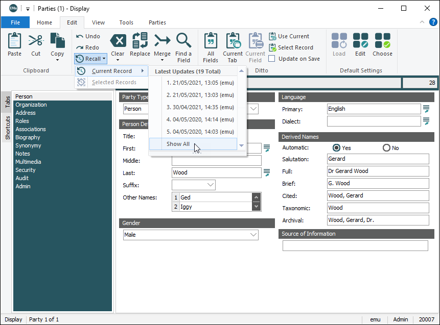 EMu's audit trail functionality maintains a complete history of changes to a record. Record Recall is an extension to this functionality as it enables authorized users to update a record with data from an earlier version of the record. Such functionality is useful where a user may, for instance, have: