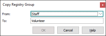 Copy all Registry entries associated with a user to a new user. As for Group except that an existing user is selected in the From drop list and the name of a new user is entered in the To field. |