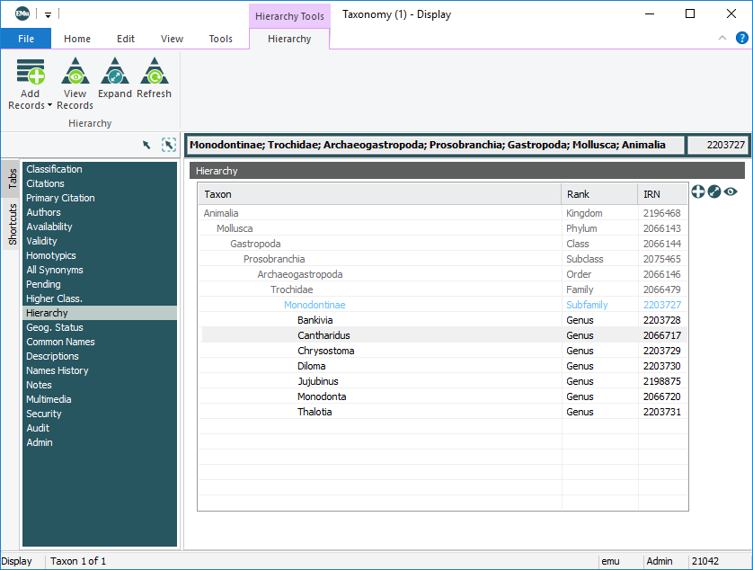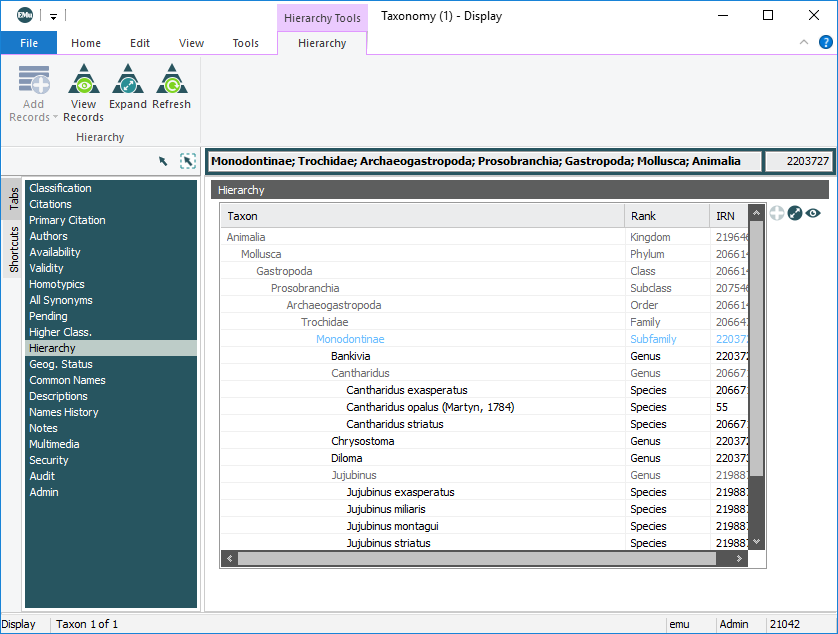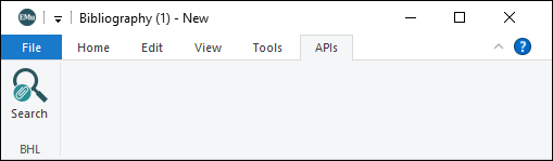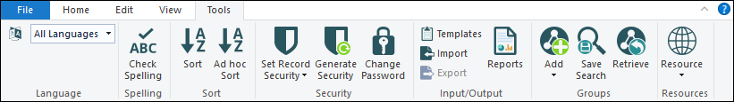 The Ribbon is a common feature of modern Windows applications, and it replaces the Menu bar and Toolbar used in older versions of EMu. The Ribbon organizes commands into tabs (Home, Edit, View, Tools, etc.) and within a tab into logical groups of commands (Search, View, Select, etc.).