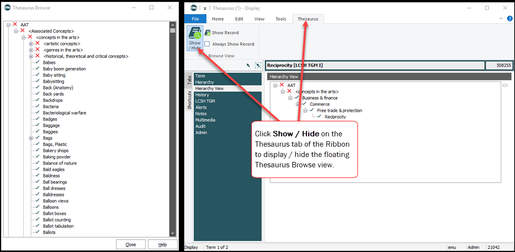 Show / hide the Thesaurus Browse View free floating panel. Browse View is a floating panel providing a hierarchical view of all loaded thesauri. It interacts seamlessly with other modes (Search, Display and Edit), views (List, Contact Sheet, Page and Details) and with the Hierarchy View tab. By default the panel displays to the left of the module, but it can be moved to any where convenient: |