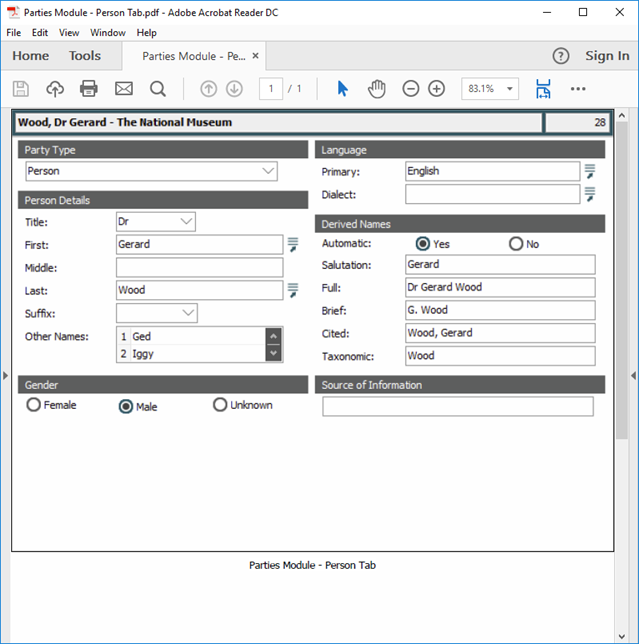Print everything currently displaying in the Display pane. If in Details view, the Summary Data and IRN will also print. In this example, the Display pane was printed to PDF: |