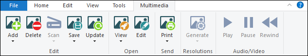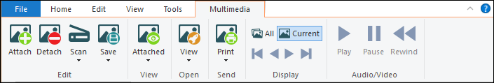 Launch an application (on your PC) associated with a media type (image, document, etc.) to edit the resource and save changes back to EMu. Note: This option is only enabled when the Multimedia tab (listed in a module's Tabs pane) is selected in Display mode. |