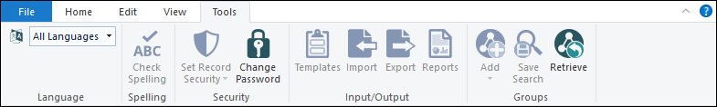 Which commands are available on the Home tab depends on the current screen mode, i.e. whether you are searching, adding a new record, displaying records or editing a record.