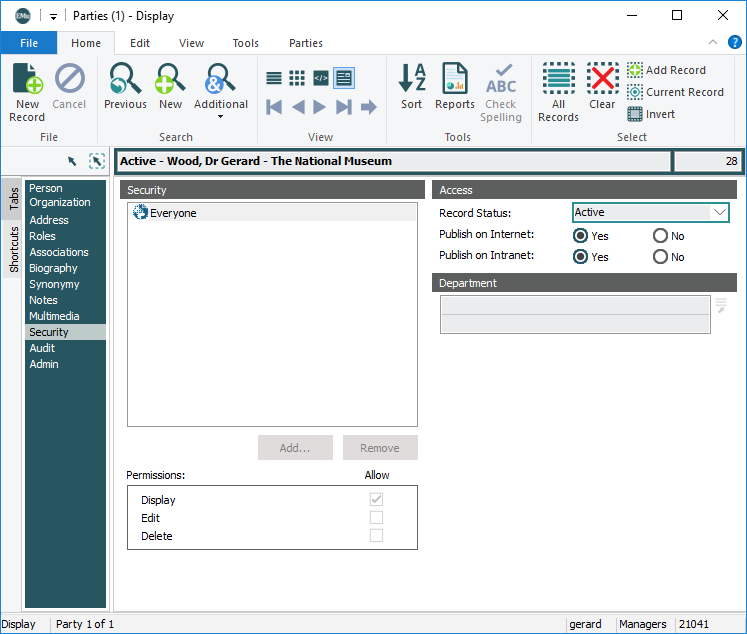 Even if a Security Registry entry is added to allow members of group Managers to edit records in the Parties module when Record Status: (Access) = Active, members of group Managers will be unable to edit the following record: