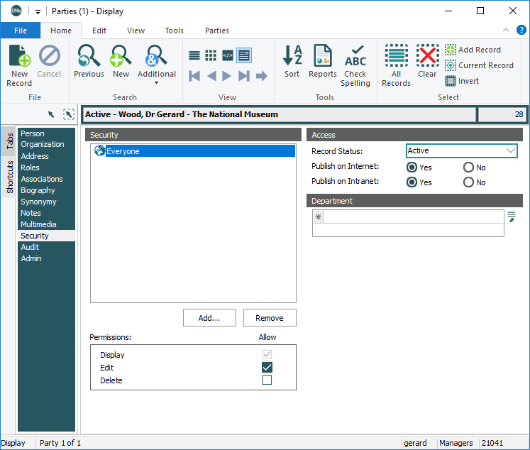 It is worth stressing that a Security Registry refines the Display, Edit and Delete permissions that a user / group has to a record, it does not replace the necessity to add the user (or a group to which the user belongs) to the Security box on the Security tab for that record and to specify permissions in the Permissions box. In other words, a Security entry that gives a user / group the Edit permission to a record when Record Status is Active, is only effective if the user (or a relevant group to which the user belongs) has been added to the Security box on the Security tab for that record and the Edit checkbox is ticked.