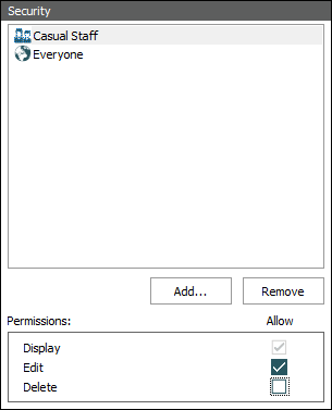 Keep in mind that if we were to take away the Edit permission from group Everyone, group Casual Staff will also lose the ability to edit the record. In this case it would be necessary to add group Casual Staff to the Security box and assign them the Edit permission: