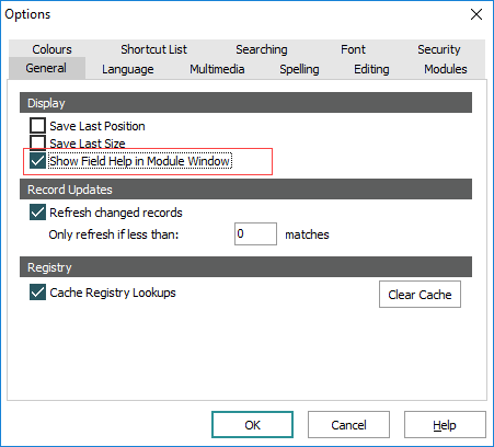 - On the General tab, select the checkbox beside Show Field Help in Module Window: