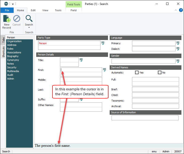 It is possible to have a field's description display automatically in the footer of a module window. In this way, whenever the cursor is in the field (the field has focus), the description will display in the module footer: