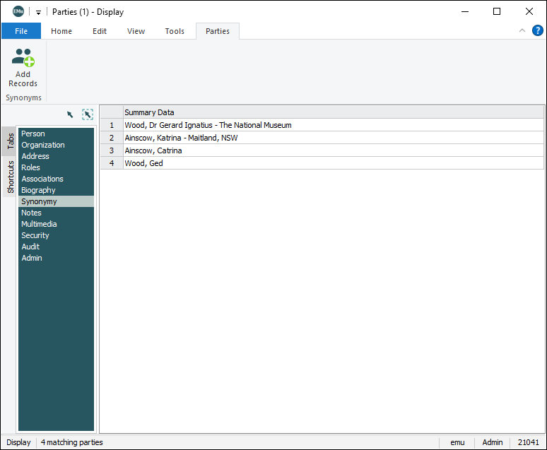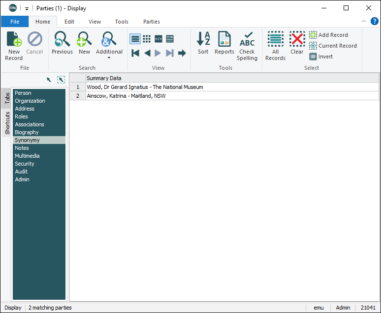Every record has a Summary Data field. Summary Data is a combination of key data in a record (taken from one or more fields). In Details View the current record's Summary Data displays beneath the Ribbon. A target record's Summary Data displays in an attachment field when an attachment has been made. Which field or combination of fields in a module is used to make up Summary Data can be specified by each institution (and implemented by Axiell developers). of the matching record displays in the Synonyms field.If more than one match is found, another copy of the Parties module will open with the matching records listed: