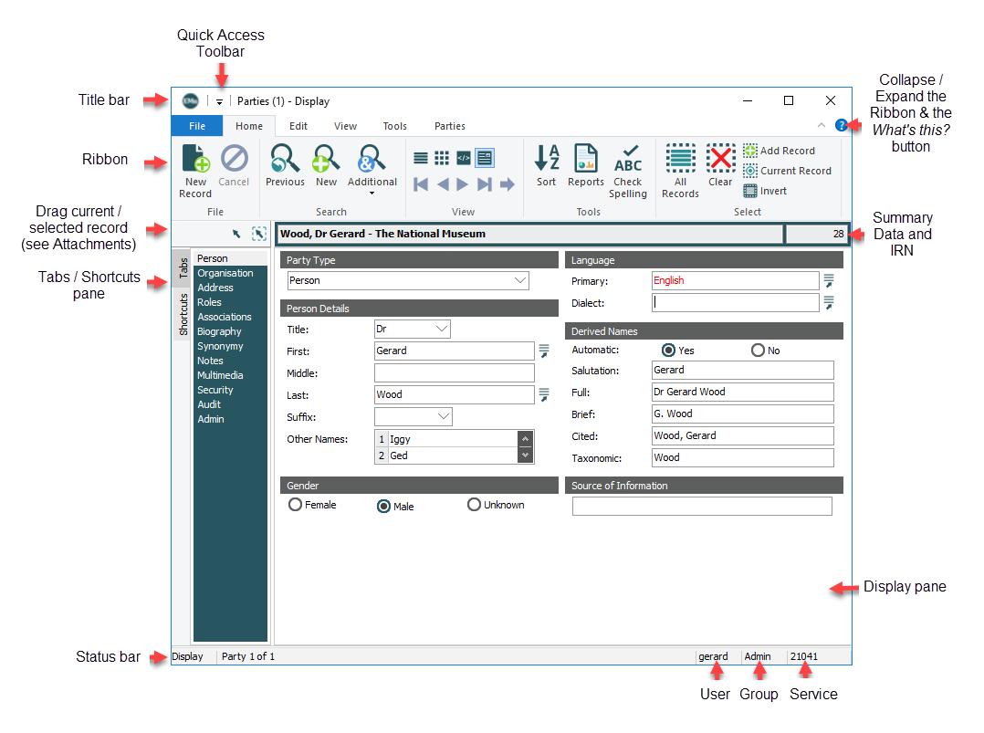 A module is made up of a number of tabs (pages), each one holding different details. A page is accessed by selecting a tab in the Tabs bar, which displays in the left pane of the module window:
