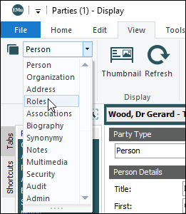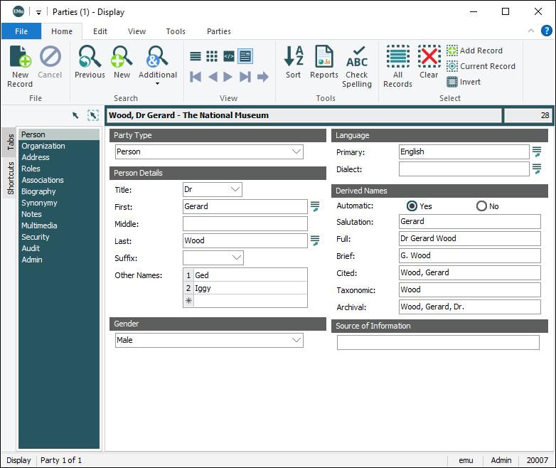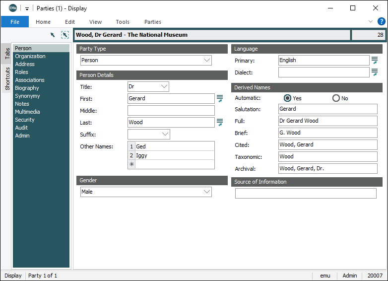 In EMu this information is stored in modules that are specific to the type of information (for instance, a Parties module stores information about people and organizations involved in some way with your collection). In a module window, users can search, display, report, sort, group, add and amend data within that module, all actions subject to a user’s security profile.