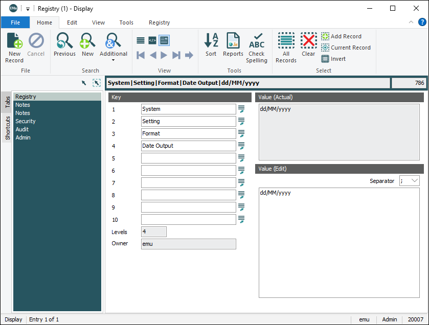 A user has the username emu and is in group Admin. The Registry is searched for an entry that defines the date format to be displayed when emu logs in to EMu: