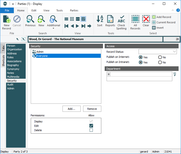Note: If you wish to restrict access to a record, be sure to remove group Everyone from the Security box.