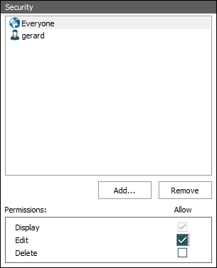 User gerard is also a member of group Managers, which is now added to the Security box. This group has both Edit and Delete permissions: