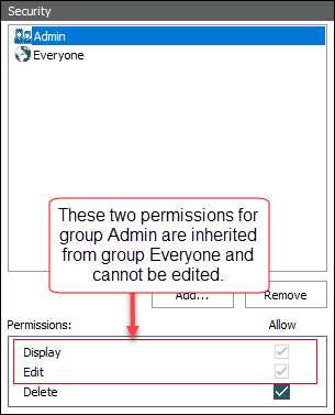 Tip: If your objective is to remove permissions for a user / group and you find that a permission is uneditable, the user / group probably inherited the permission from another group added to the Security box.
